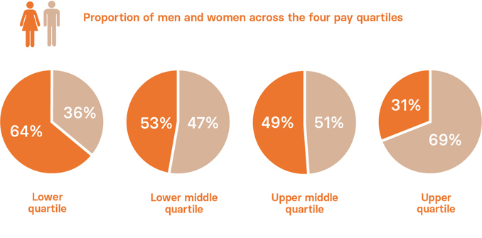 A gender imbalance in favour of males continues to exist in the upper quartile pay range of the organisation, and this is driving the overall gender pay gap.